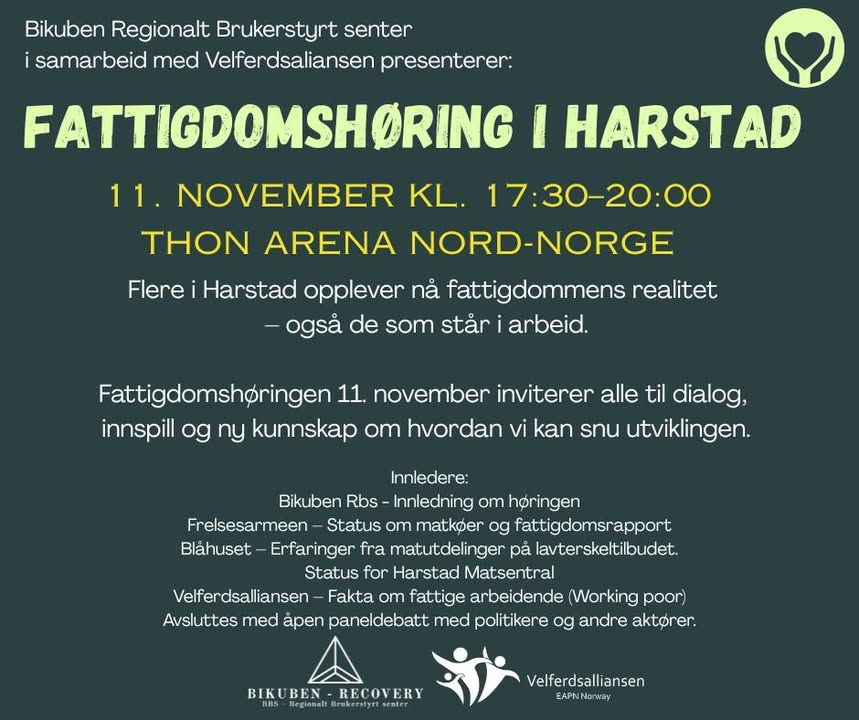 Flere mennesker i Harstad og landet for øvrig kjenner nå på fattigdommens realitet også de som står i arbeid. Matkøene vokser, og både Frelsesarmeen og Blåhuset opplever økende pågang til sine lavterskeltilbud. Under fattigdomshøringen inviteres alle – innbyggere, organisasjoner og politikere – til å delta, komme med innspill og få oppdatert kunnskap om situasjonen. Hva…
